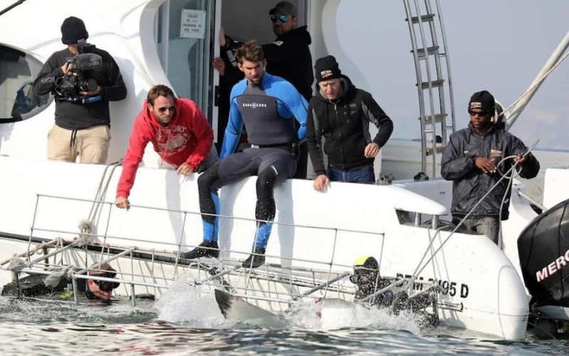 La particular prueba se desarrolló en aguas abiertas, a apenas 13 grados celsius, y el equipo del programa creó un carril de natación en el que Phelps nadó con 15 buzos debajo de él.