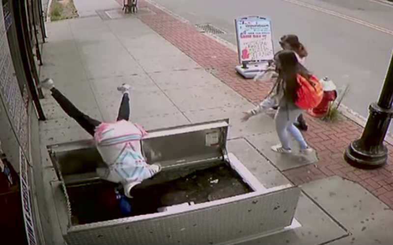 El video de una cámara de seguridad de un negocio en Plainfield, Nueva Jersey, capto el momento en que una mujer de la tercera edad camina por la banqueta mirando su celular, momentos más tarde cae a pozo de servicio desde una altura aproximada de 1.80 metros.